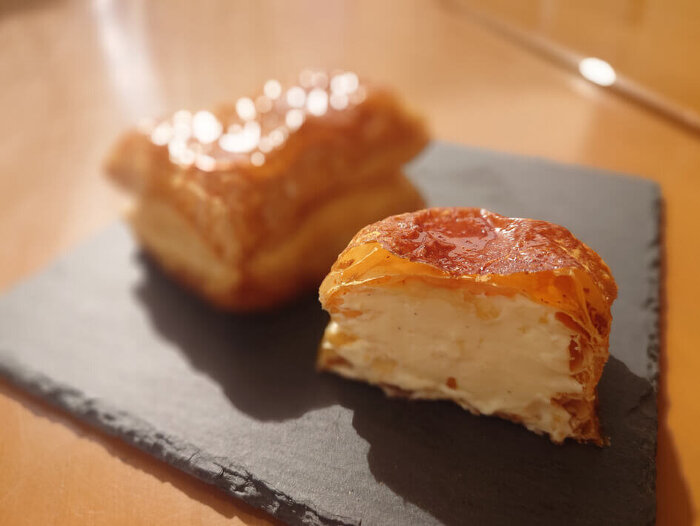 カスタードパイ 最高のパリパリ食感をお届けしたい! サクサクを超えた、極上のパリパリ食感。幾重にも重ねた繊細なパイ生地に、濃厚でなめらかなカスタードクリームをたっぷり詰め込んだ**「カスタードパイ」**が新登場。 ミルフィーユ好きの方にはたまらない、バターが香る繊細な層と、とろけるクリームの絶妙なハーモニー。お口の中で広がる贅沢な食感と、上品な甘さをぜひご堪能ください。 ミルフィーユ好きのあなたへ。 極上のパリパリ食感とカスタードの甘みを、ぜひ味わってみてください!