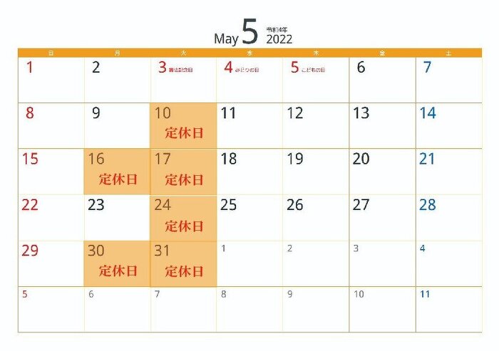 5月営業日になります。GW中につき、3日は営業いたします。宜しくお願い致します。