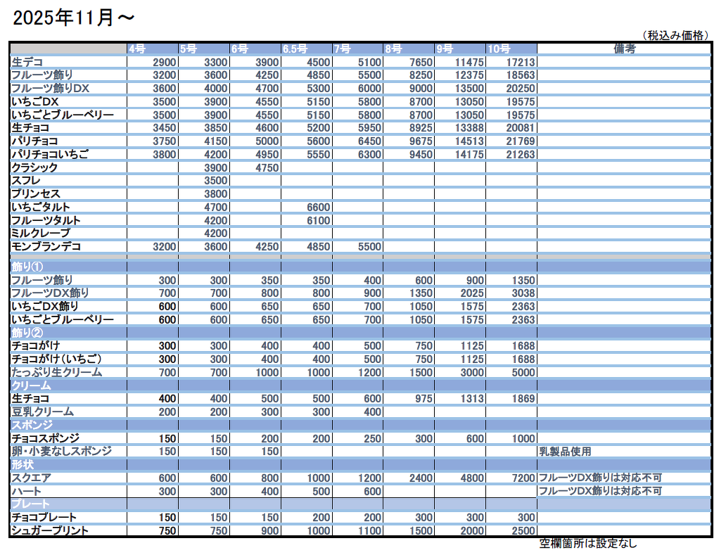 NEWS 25年11月価格改定のお知らせ 2025.10.24 25年11月よりデコレーションケーキの一部価格改定を行います。 昨今の原材料高騰のため、ご理解いただけますと幸いです。 10月中のご予約であれば旧価格で対応させていただきます。 ご予定のございますお客様はお早めにご連絡ください。 一覧を見る